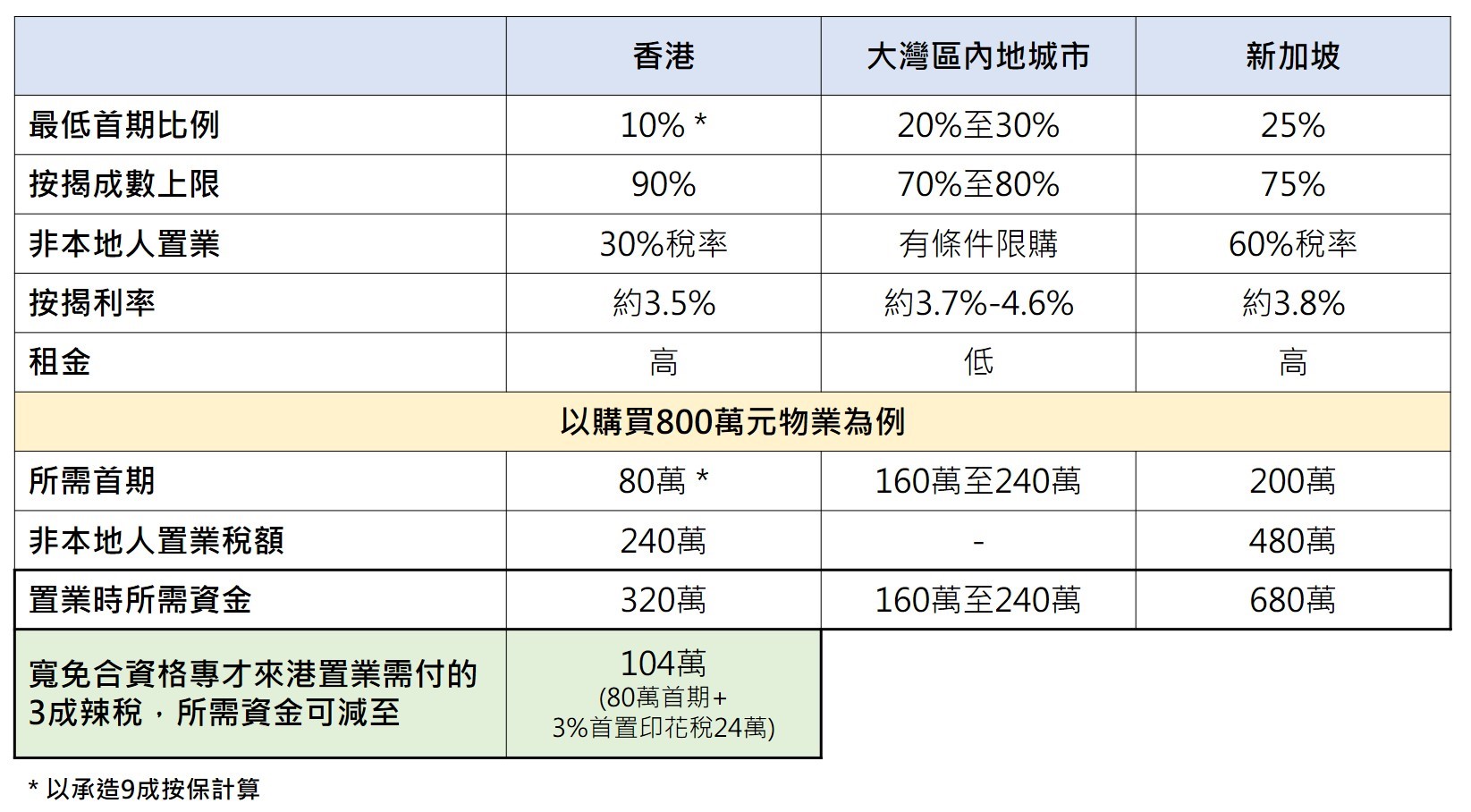 事实上,香港楼市对中外人士仍然极具吸引力。香港作为大湾区一员,在港首次置业缴付的首期相对大湾区内其他城市为低;本港租金较内地高,但按息却相对较低,买楼实在更为划算。以购买一个800万元单位为例,香港首期(以承造9成按保计算)只需要80万元;反观,大湾区其他城市最低首期需付2至3成,即160万至240万元,可见本港首期相对较低;然而,由於非本地人在港置业需要缴付3成辣税,以上述个案计算,即高达240万元,连同1成首期,合共高达320万元,占楼价4成之多!入市门槛大幅上升,远高於大湾区其他城市,可见辣税大大减低专才来港落地生根的意欲。因此建议彻底宽免合资格专才来港首次置业需付的3成辣税,只需缴交首置的从价印花税,届时入市门槛比起大湾区其他城市为低(见表)。