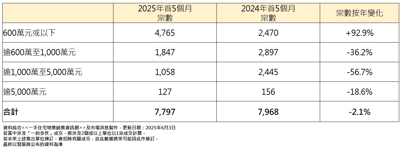 表二:2025年首5个月不同金额的一手成交量按年变化